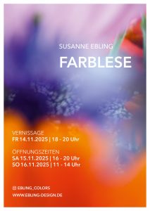 14. 11. bis 16.11. 2025 Susanne Ebling Farblese Vernissage:Fr 14.11.2025 | 18 – 20 Uhr Öffnungszeiten:Sa 15.11.2025 | 16 – 20 UhrSo 16.11.2025 | 11 – 14 Uhr Die Ausstellung „Farblese“ präsentiert fotografische Arbeiten mit außergewöhnlichenPerspektiven auf Farbe und Fotografie. Sie zeigen farbsinnliche Bildwelten zwischenMalerei, Erinnerung und Atmosphäre. Ausgangsbasis für die Ausstellung ist das kontinuierliche, fotografische „Lesen“ vonFarben, Licht und Strukturen im Wechsel der Jahreszeiten ist. Im Sichtbar machen vonüberraschenden Zusammenhängen und im Loslösen von klassischen Bildstereotypenentstehen eigenständige Werke, die Räume für Reflexion, Emotion und Identität öffnen. Farben sind hier mehr als ein visuelles Element. Sie beschreiben die Farbidentität einesLebensraums.…