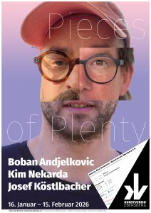 16. Januar bis 15. Februar 2026 Boban Andjelkovic, Kim Nekarda, Josef Köstlbacher Pieces of Plenty Freitag, 16. Januar, 19 Uhr: EröffnungSonntag, 15. Februar, 15 Uhr: Finissage | Künstlergespräch Öffnungszeiten Freitag 18 – 20 Uhr | Samstag 16 – 20 Uhr | Sonntag 15 – 18 Uhr