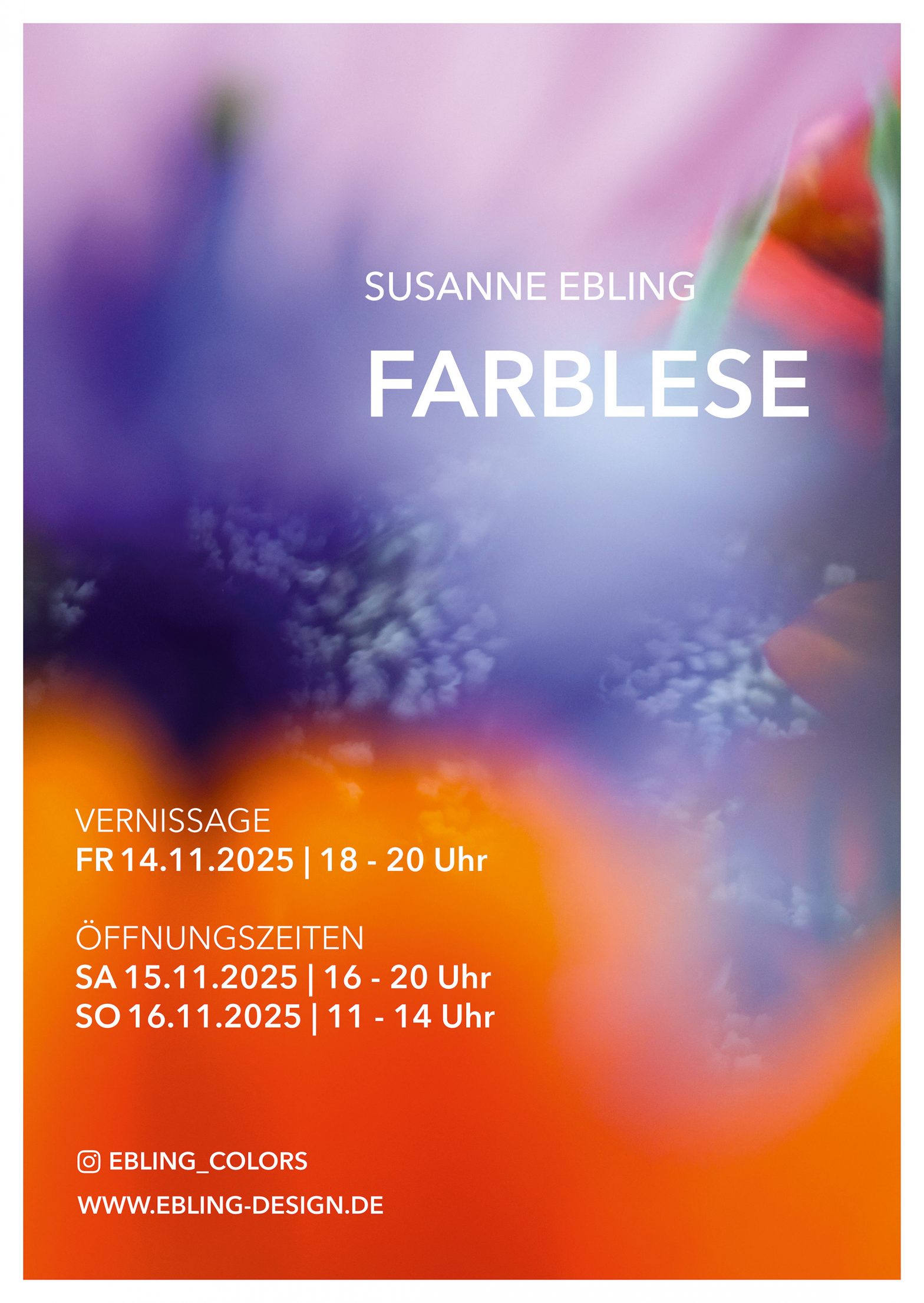 14. 11. bis 16.11. 2025 Susanne Ebling Farblese Vernissage:Fr 14.11.2025 | 18 – 20 Uhr Öffnungszeiten:Sa 15.11.2025 | 16 – 20 UhrSo 16.11.2025 | 11 – 14 Uhr Die Ausstellung „Farblese“ präsentiert fotografische Arbeiten mit außergewöhnlichenPerspektiven auf Farbe und Fotografie. Sie zeigen farbsinnliche Bildwelten zwischenMalerei, Erinnerung und Atmosphäre. Ausgangsbasis für die Ausstellung ist das kontinuierliche,…